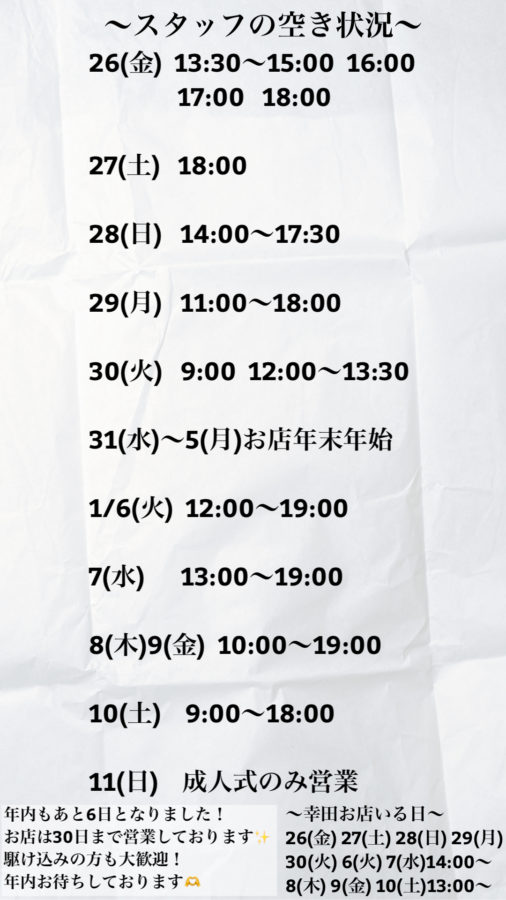 年内もあと少しとなりました