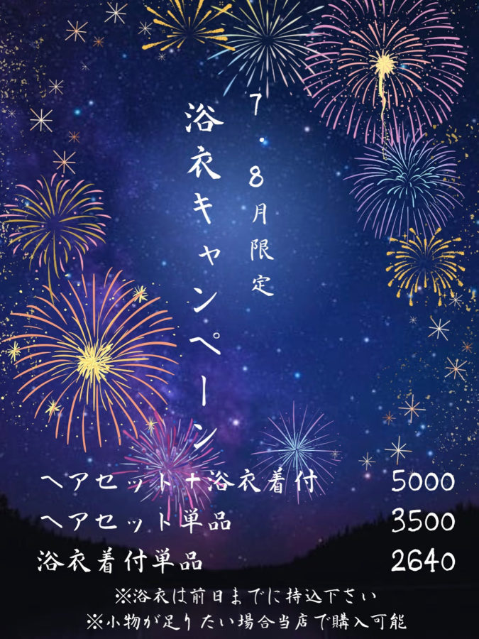 COEUR ORNER 2025.07.08 7・8月限定浴衣キャンペーン 7・8月限定で ヘアセット浴衣着付 通常¥6140のところ ¥5000で可愛くなれます!! 是非この機会にご予約お待ちしております🌻